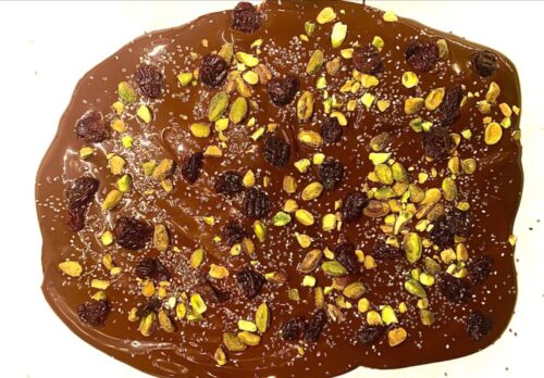 - Evenly sprinkle pistachios, cherries, and chia seeds on top of the chocolate.