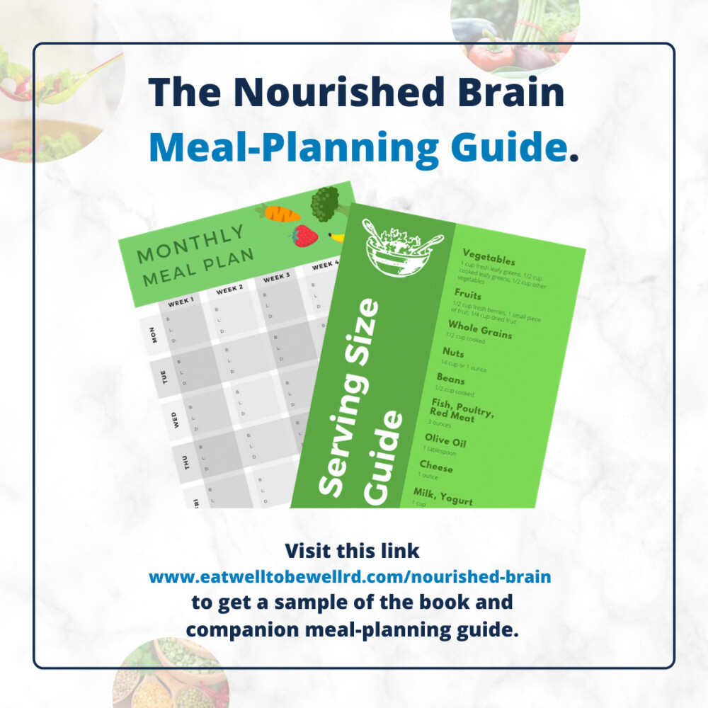 I’ve created a printable meal planning template to give you a good example of how to create a brain-healthy foods menu for one week for you and your family. It also includes a monthly calendar, grocery list, and serving size guide to help you choose the best brain-healthy foods for your meals.